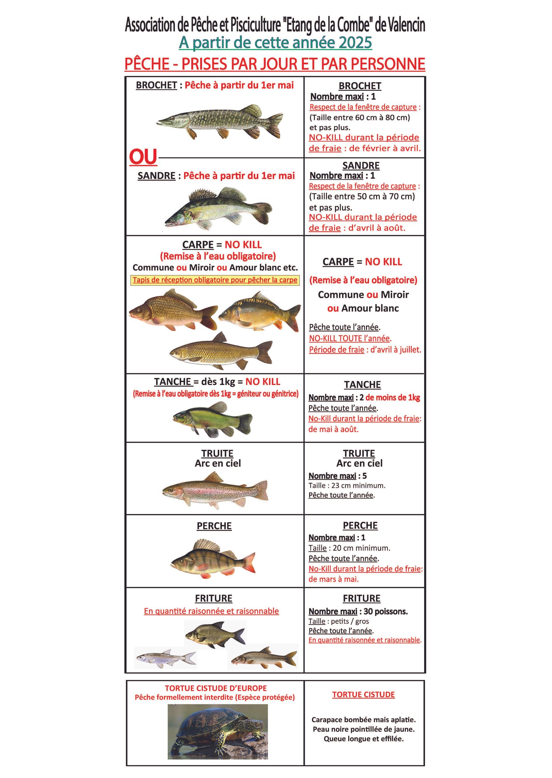: sans ardillon, sans appâtage tout au long de l'année afin de limiter l'eutrophisation (pollution par des agents et diminution prématurée de l'eau dans un espace), le tout en no-kill pour certaines espèces afin de les préserver, protéger et de mieux les gérer.