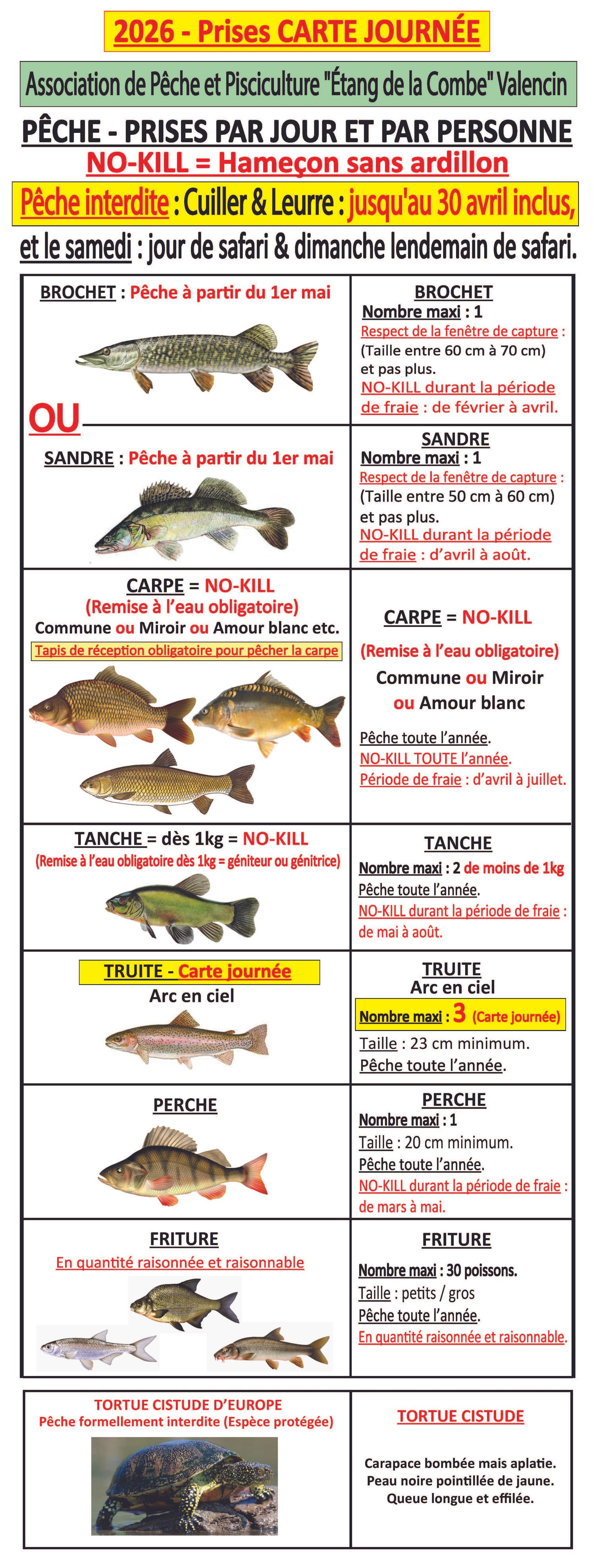 : sans ardillon, sans appâtage tout au long de l'année afin de limiter l'eutrophisation (pollution par des agents et diminution prématurée de l'eau dans un espace), le tout en no-kill pour certaines espèces afin de les préserver, protéger et de mieux les gérer.